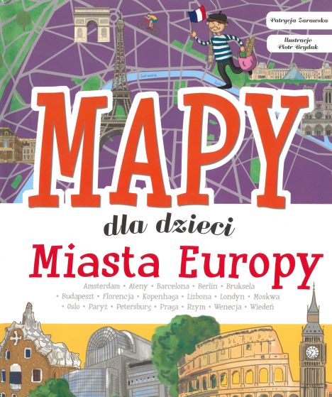 Mapy dla dzieci : miasta Europy / [tekst] Patrycja Zarawska ; [ilustracje Piotr Brydak]. - Wydanie I. - Warszawa : Wydawnictwo SBM, copyright 2019. - 95, [1] strona : ilustracje kolorowe ; 31 cm.
